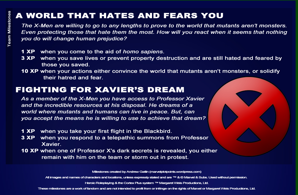 The goal with these milestones is to provide opportunities for your character to have some of the signature experiences of each team. In this case you have a hook related to mutant hatred and another to the emotional roller coaster to which Professor Xavier sometimes subjects the X-Men. These are two experiences nearly every member of the X-Men will have at some point in their careers. Be sure to check back later this week when we’ll give you the datafile for what I consider to be one of the most entertaining characters to come out of X-Men in the 90s: Gambit!
