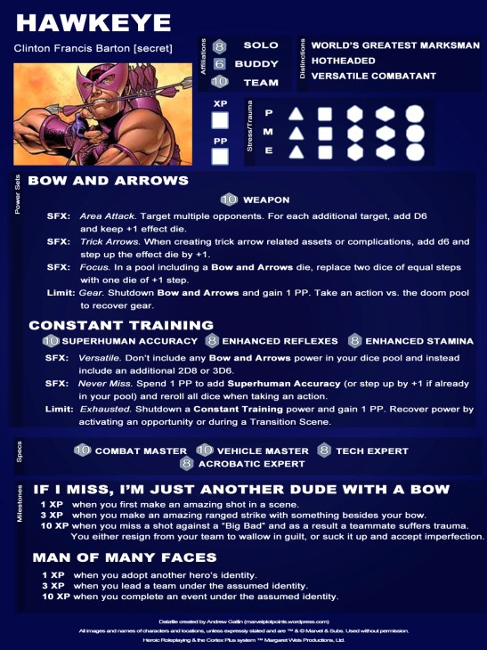 I have a question, though. Shouldn’t Hawkeye have a D6 Swining in the arrows power set? He has appeared in many comics moving through the city that way.