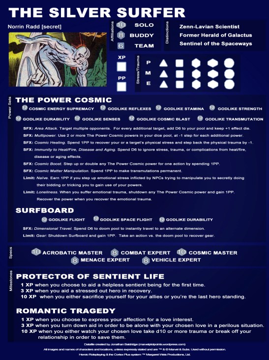 Considering his level and power, but mostly his narrative impact, his is a heavy hitter a threat for the FF. Have you considered 3 powers sets, Power Cosmic, Surfboard, and Cosmic Altered Body (something to that effect). Put the strength, stamina, reflexes in the latter. The transmutation, sense and cosmic energy in the power. Really opens him up.