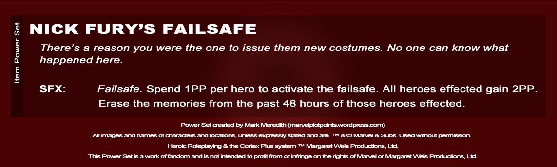 How would someone who was using Nick Fury as a watcher character use the Failsafe? Watcher characters have no pp to spend. Do we just award the pp, do we also lose d6 per hero, must we spend 2d12 since we are essentially ending that scene? I don’t want to run out of dice in the doom pool right before the stop the bomb scene.