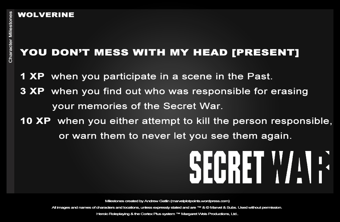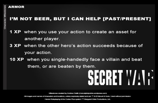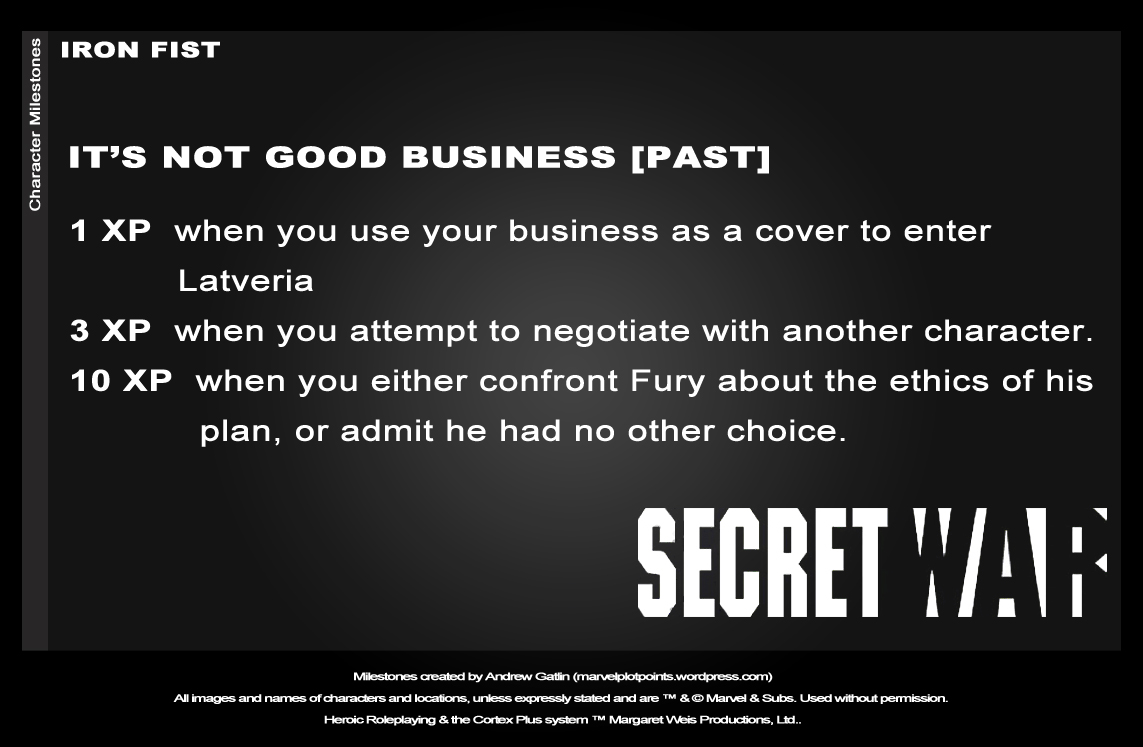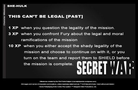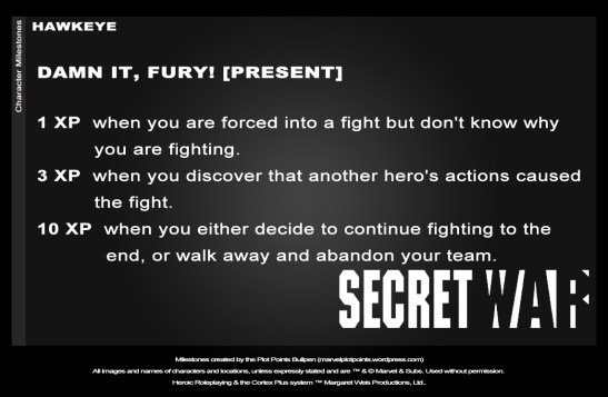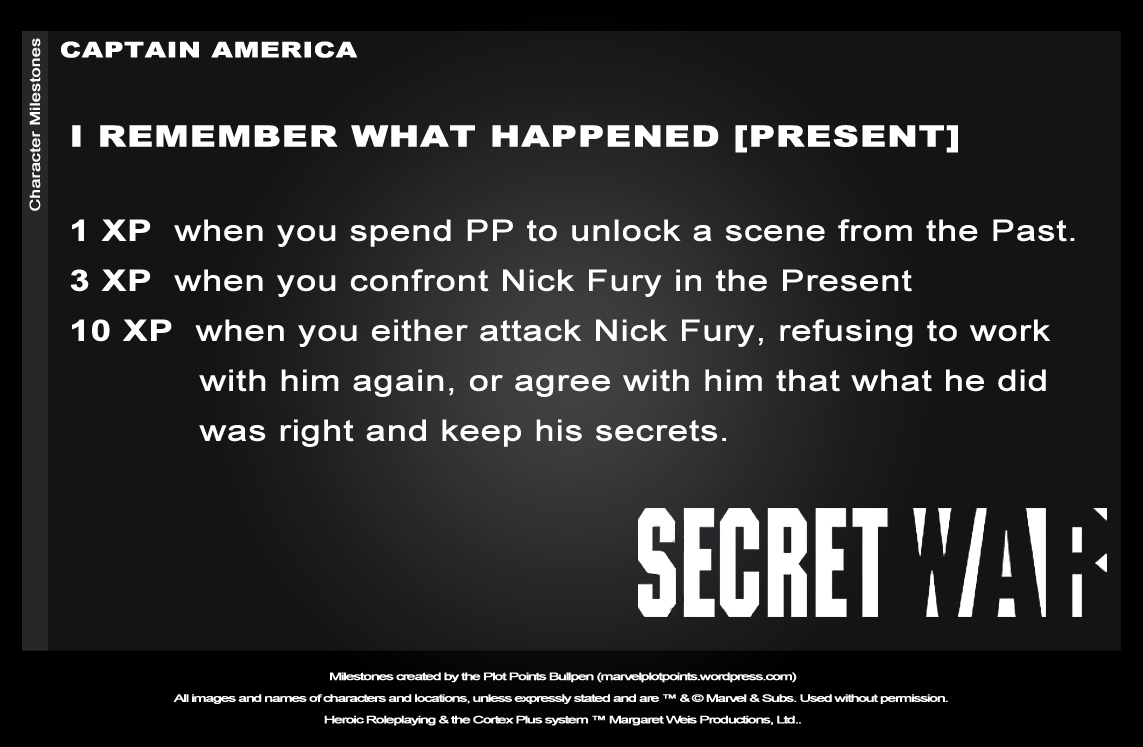 This is our first entry from the Plot Points Bullpen! Three of us, Andrew, Felipe and myself, have worked on new Character Milestones for any character involved in the Secret War (the list of characters was mentioned last week with Nick Fury and Daisy Johnson).