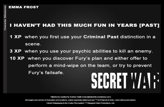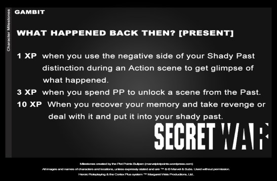 A player choosing one of these heroes can swap out one of his milestones with one of these. If the milestone says “Past” or “Present”, they can only fulfill the milestones within those scenes.