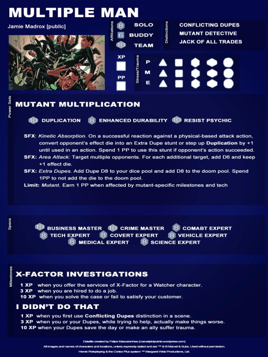 Design-wise, the main challenge was to emulate his Duplication power, because on the Basic Game there isn’t such power set. I had two ideas, the first was to make him able to create mobs, but since it would create the need for a whole subset of rules, I decided to go with the second idea, which was a more subtle and PP/SFX dependent approach.