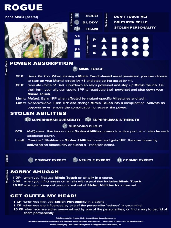 2) Taking a look at a “typical” power theft scene, Rogue grabs the arm of Opponent A and hoovers their powers for herself. Opponent A is now powerless (see question 1, above) and, depending on the author, knocked unconscious. Mimic, on its own, does not inflict stress, and I am fairly certain that the unconsciousness does not stem from Rogue’s strength (she’s not breaking said Opponent A’s arm), so where would this come in? I could see arguing for a PP expenditure to inflict stress, but that would indicate that this is an optional side effect of Rogue’s power, which it certainly isn’t (hence the whole reason she’s weary of relationships, etc.)