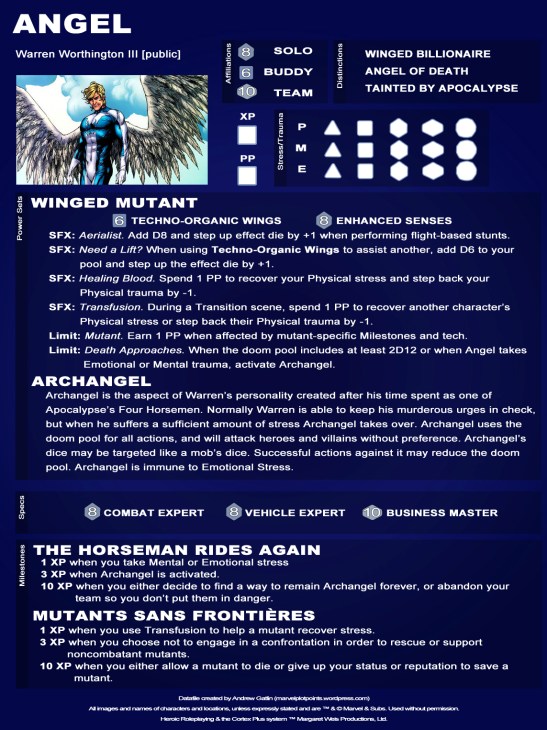 This character is one that seems to get a different treatment depending on who is writing him. I chose to stat him up as he appears in the first arc of the 2009 X-Force run, “Angels and Demons”. In other words, his default state is a normal human appearance with apparently feathered wings. If you want to play the version that has the metal wings, but still has control of himself, step up Techno-Organic Wings to D10 and add Poison Darts D8. I would also add the Area Attack SFX.
