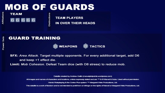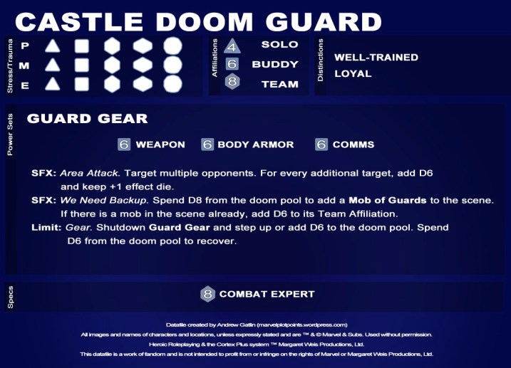 This scene is a running battle through Castle Doom as the characters try to make their way to the Throne Room and the confrontation with Lucia Von Bardas. Use your own judgement to decide how many locations the team will need to work through to reach their goal. The difficulty in this scene is not that the individual enemies are that tough, but that there are a whole bunch of them. Most of the enemies in this scene are “faceless minions”. The players don’t necessarily have to defeat every enemy in a location before moving to the next. But, if they don’t, the enemies may try to follow them or call ahead and warn their allies that the characters are coming.