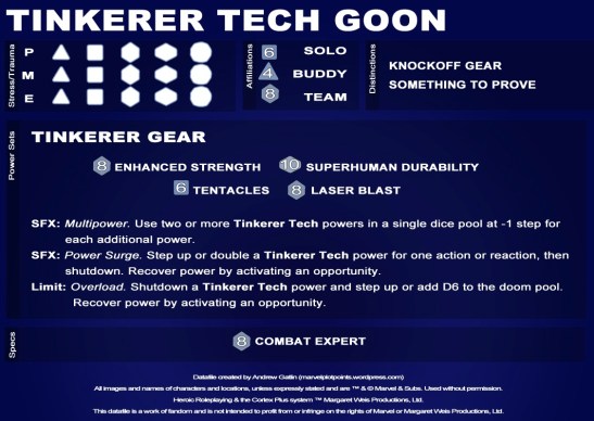 Optional: Add knockoff versions of “Named Villains” to this combat. Choose one (or more) of the Secret War tech-based villains and ignore any Distinctions, Powersets, or Specialities not directly tied to the tech they are using.