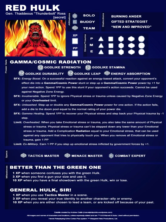 Think about it. If you do D10 Emotional stress to Red Hulk, every attack that targets him after that gets to add both Emotional and Physical stress die to its pool. That’s pretty limiting to me. Also keep in mind that his Physical stress will never be lower than his Emotional stress. And even after he reduces his Emotional stress, he will still have the Physical stress to deal with until he can step it down too.