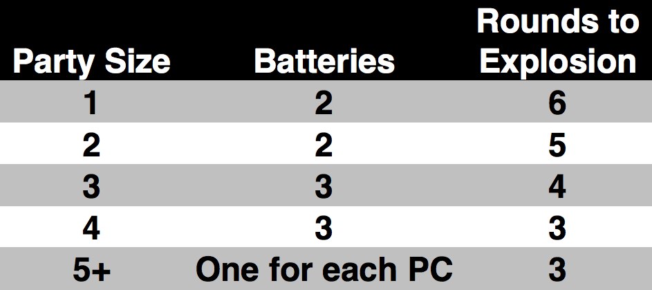 The heroes must either take down Cyborg-Lucia and dismantle the energy bomb she is preparing to release by siphoning the energy from the other fallen tech villains. The amount of enemies she is going to raise as “batteries” and the number of rounds it will take will depend on the size of the party, according to this table: