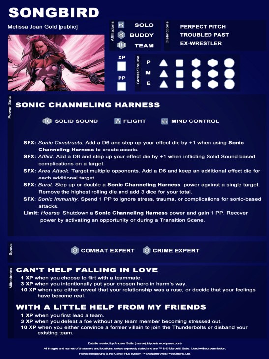Songbird is one of the longest tenured members of the Thunderbolts, so I thought she was the obvious choice for the tie-in file. Here’s a link to her Marvel Bio.