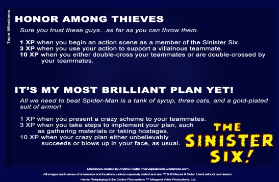 It’s Spidey villains week here at Plot Points! On the plate today is an attempt to give you some milestones if you want to try a villain-centered game. I came up with these Team Milestones with the Sinister Six in mind, but they should work for many other teams of villains.
