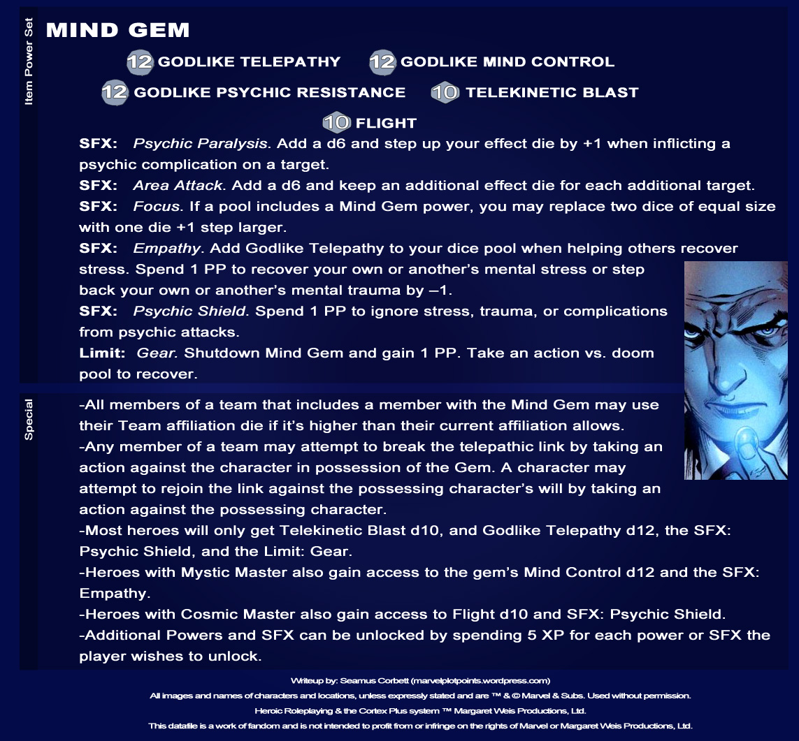 When we do the Gauntlet, we’re going to create a separate set for that item so that the idea will be not to use them all individually, but as one item. The design here also assumes that the character wielding the Mind Gem (and, going forward, the others) can handle the immense power it contains, hence the Specialty requirements. For anyone that happens to have the Civil War book, it’s a play on Mjolnir (“If he be worthy,” and all).