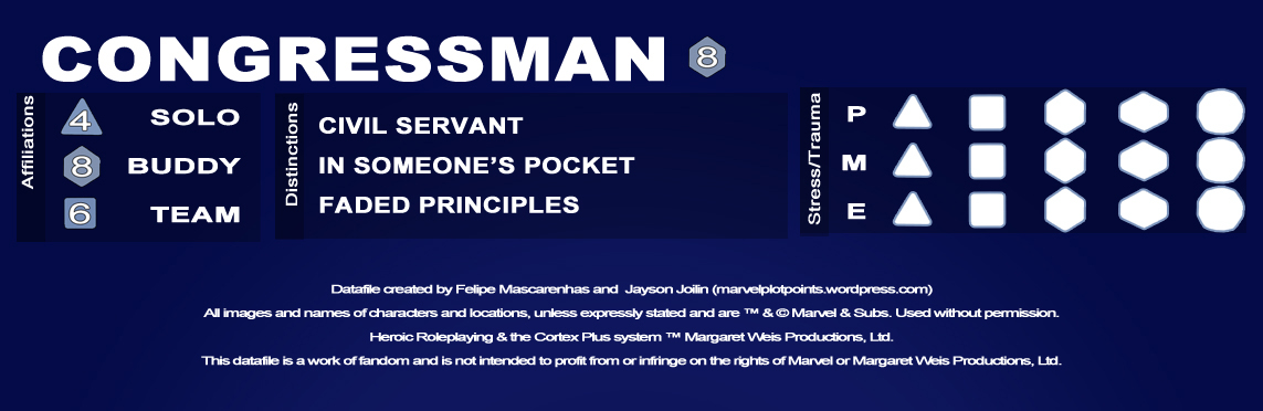 As a CIVIL SERVANT, the congressman is obliged to hear all cases presented to him/her, either in person or through a staff member, but is also obligated to consider what is in the best interests of the state that he/she serves. Since her or she is IN SOMEONE’S POCKET, the congressman might have a compelling reason to be in favor or opposed to the MRA, but if the heroes figure out who “owns” the congressman, they can make that work against him/her. Finally, the congressman has FADED PRINCIPLES; some cause for which he/she became a politician in the first place and which may have bearing on this issue.