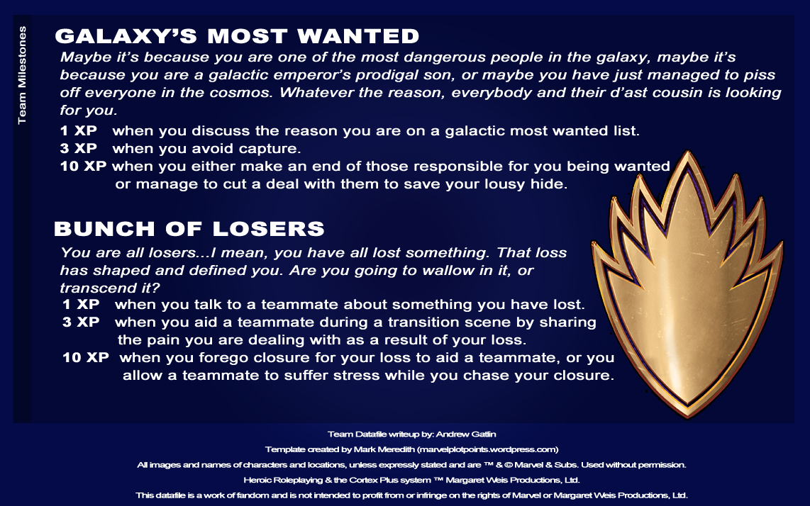 Today we’ve got team milestones for the Guardians. I pulled inspiration from the recent Marvel Now! run as well as one of the themes in the movie. Let me know what you think.