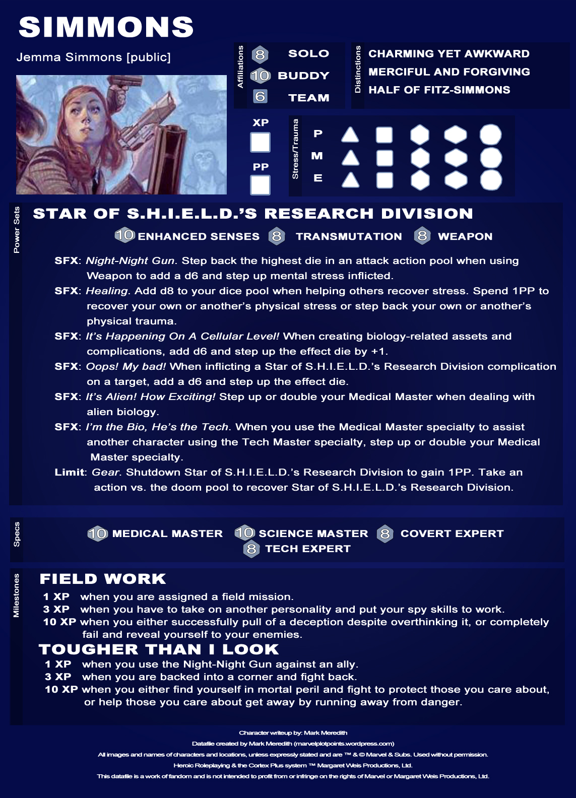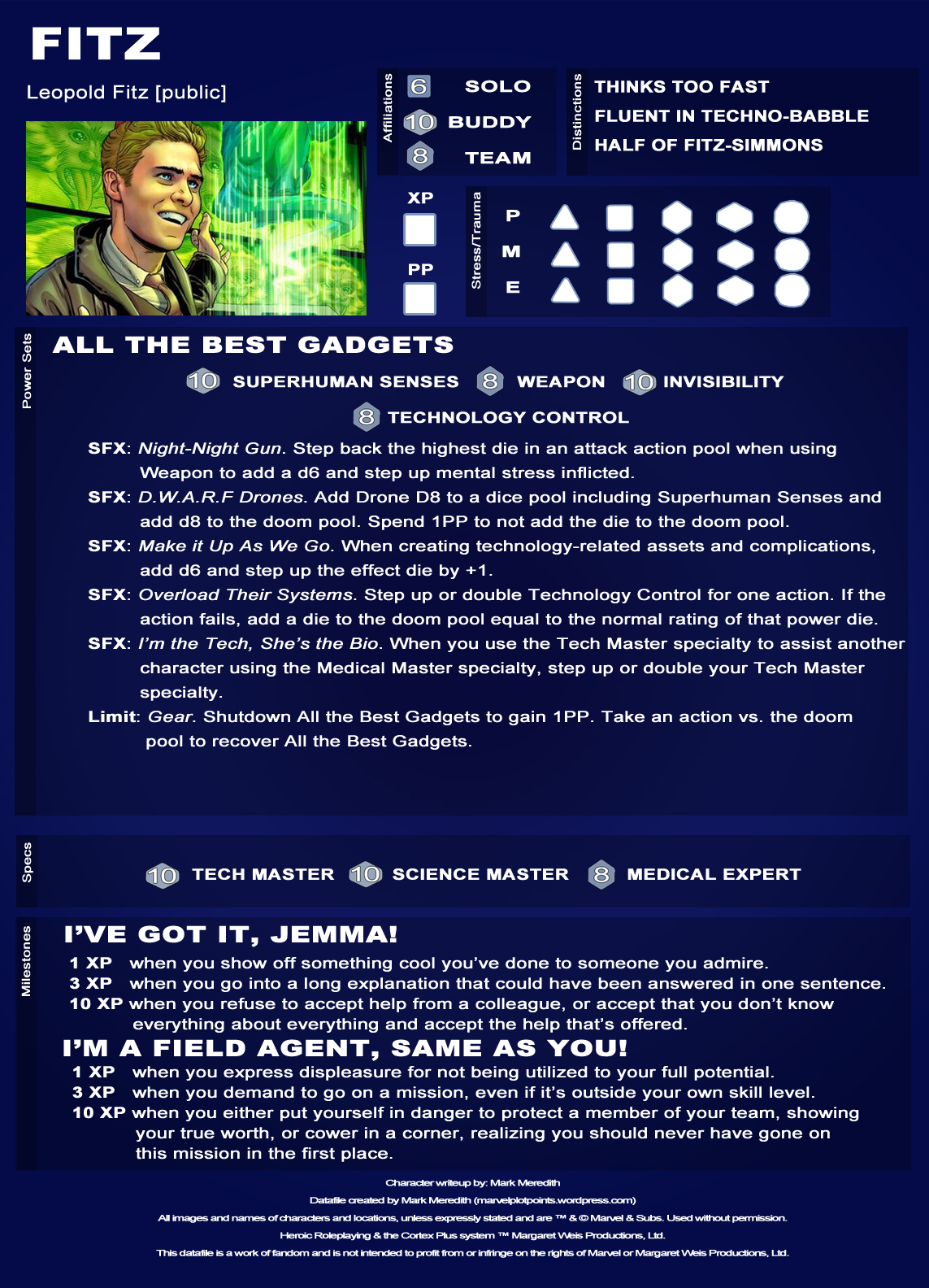 Today, here’s Fitz-Simmons, the two wunderkinds of science! You’ll note I gave Simmons a little Transmutation. This helps simulate all the fancy future-tech equipment and knowledge she has. Enjoy!