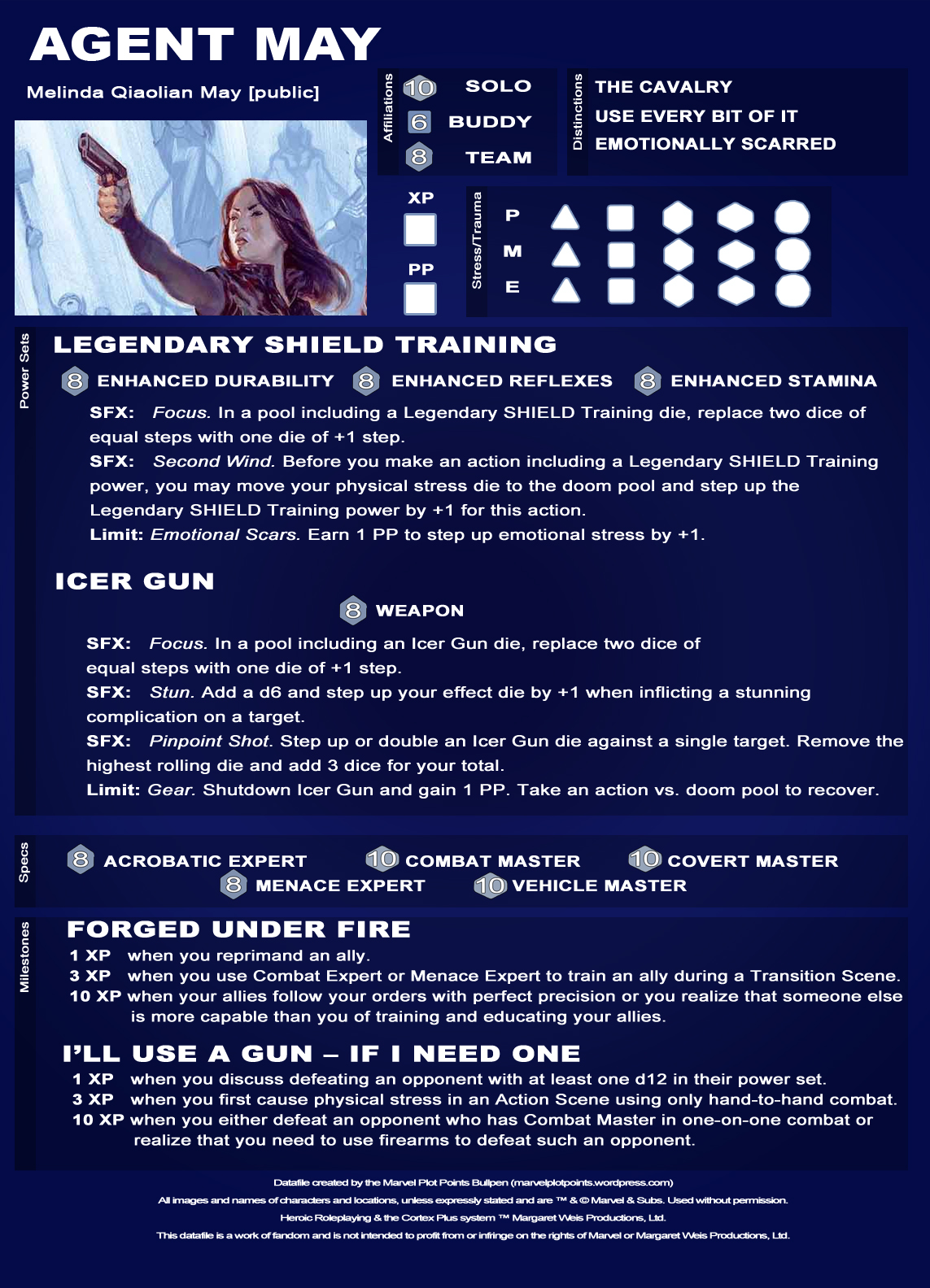 How about that mid-season finale? Am I right? Anyhow, today, for your HYDRA-whooping pleasure, we present Agent May. She’s always played to me like another Black Widow, so you may notice the similarity in the training, but May brings a little more boot for butt-kicking. I also added the Icer Gun to May’s datafile. You may notice a difference between May’s gun and Fitz’s “Night-Night Gun”. The in-house discussion here was that different people with different levels of expertise can find different ways to use the same item. Another fine example of this is how anyone can pick up Captain America’s shield, but not everyone can boomerang it around and hit everybody quite the way ol’ Steve Rogers can.