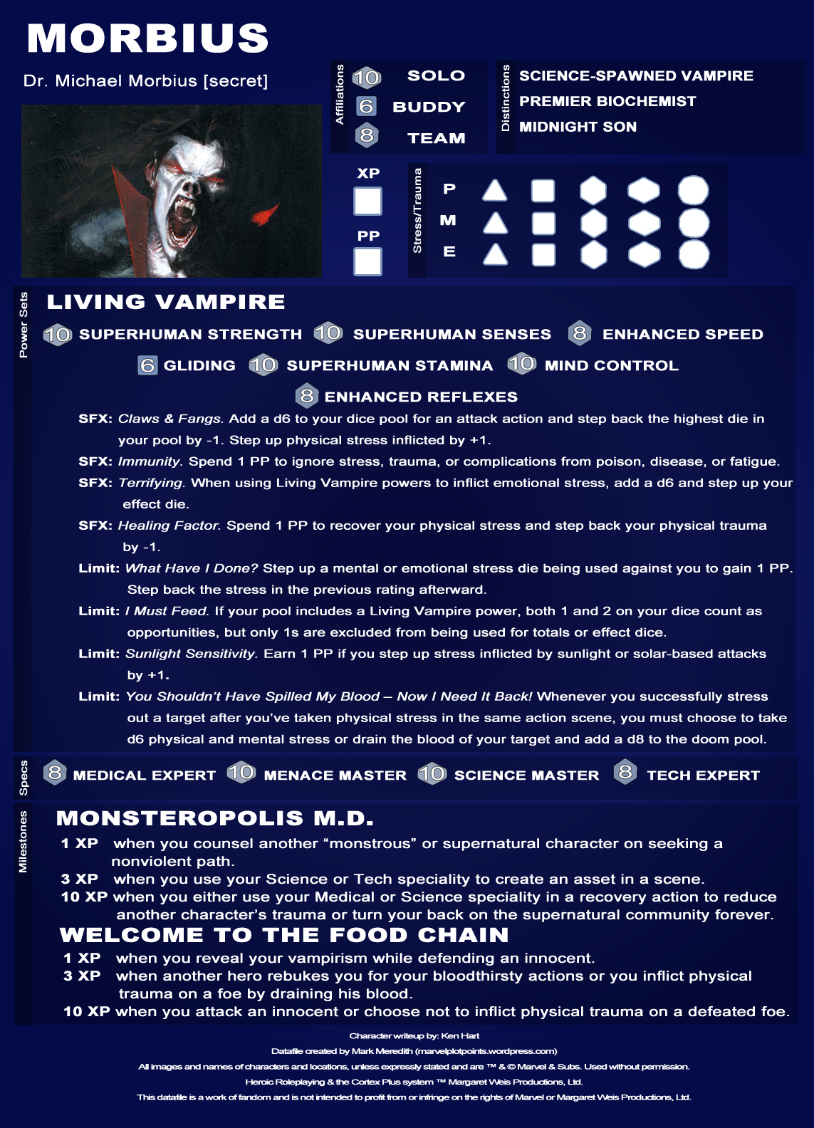 The recent series by Joe Keatinge and Rich Elson did a great job of delineating Morbius’ powers and limits, so those are reflected here, along with milestones pulled from his solo appearances and the Legion of Monsters miniseries. And for those occasions when Morbius is the “bad guy,” I’ve also created a Watcher file. Drink it up!