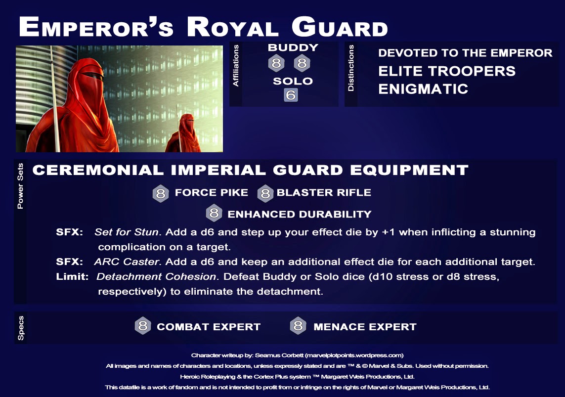 Emperor Palpatine rarely travels without his retinue of Imperial Guardsmen who are rumored to be proficient force users. Whatever their affinity for the dark side, they are powerful warriors and not to be underestimated.