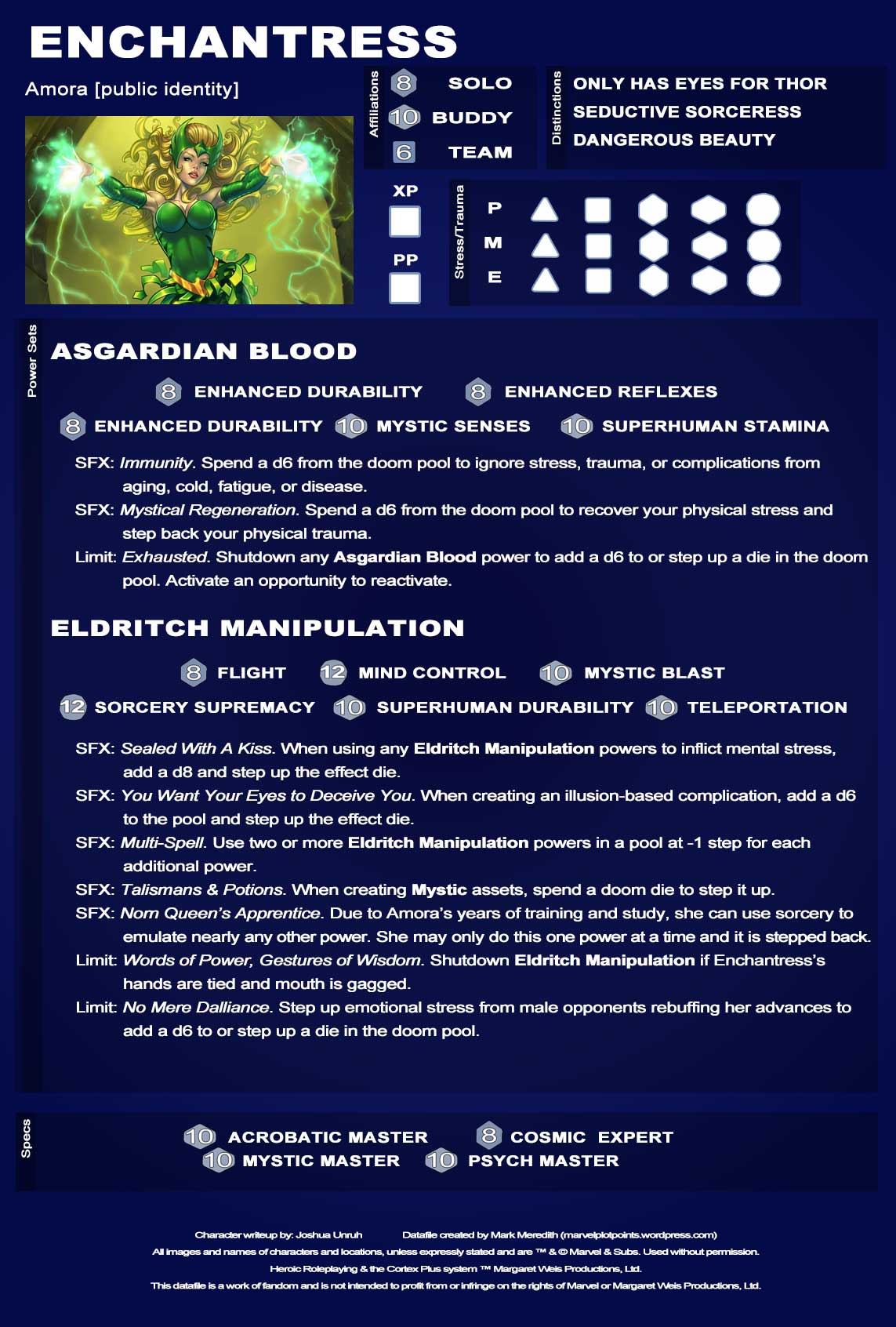 Amora is a magical powerhouse. Games with high magic will find her an able foe to face and more mundane heroes will have to beware her bewitching enchantments.