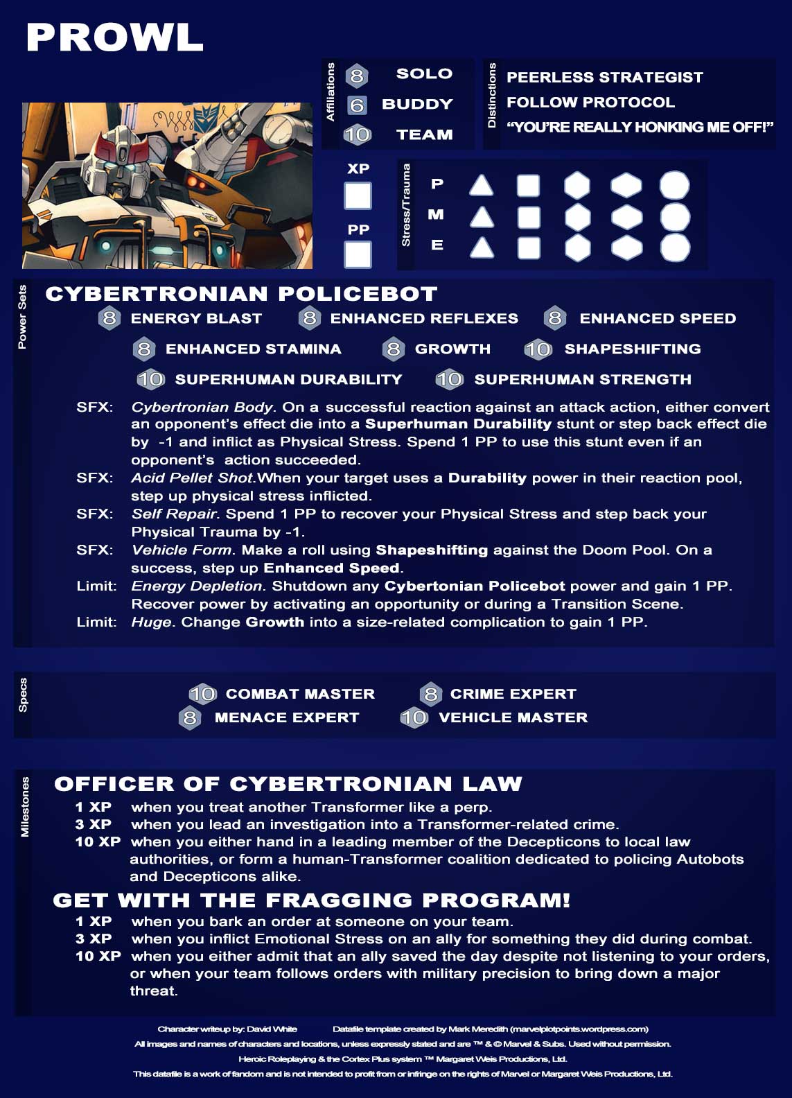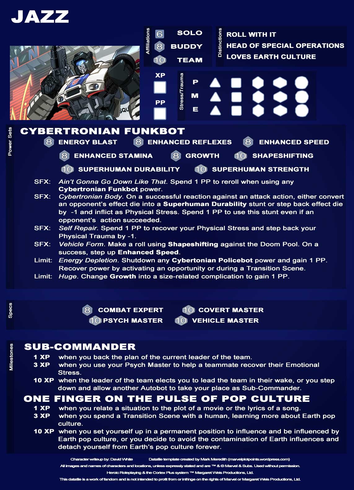 Prowl and Jazz are the buddy copbot comedy that practically writes itself. Prowl is the by-the-book stickler and Jazz is the off-the-wall loose cannon. Together, they will help Optimus Prime secure freedom and justice throughout the galaxy for all beings. I hope these two characters bring plenty of great roleplaying and memories to your tables.