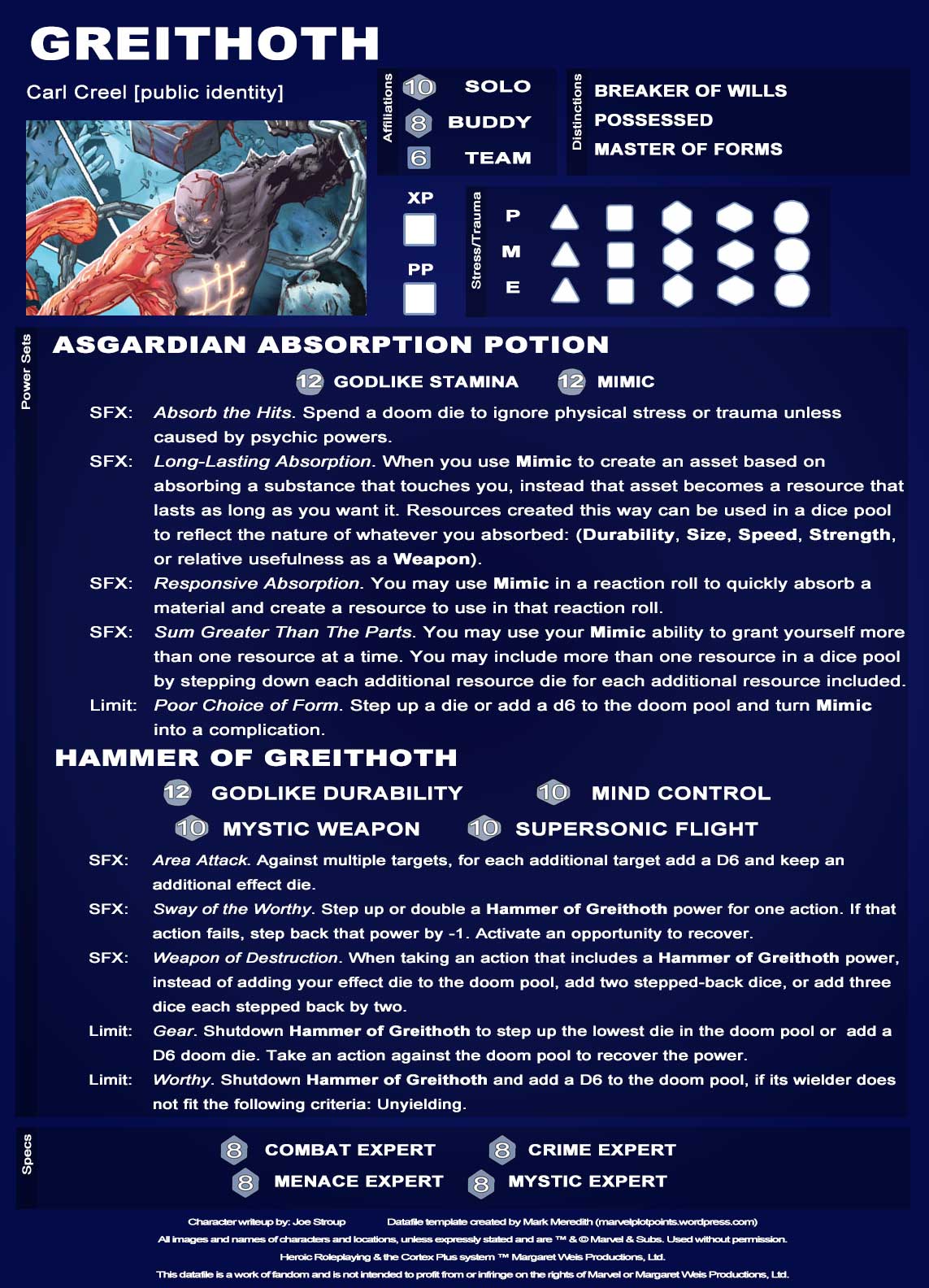 We thought it would be useful to break these up a little bit so we first we have a datafile for Titania without the powers of the hammer. She is a powerful female opponent and long time rival of She-Hulk so it’s great to have her for this event or for getting into trouble with her husband the Absorbing Man as they go on a crime spree that can only be stopped by your heroes. We’ve also got Carl Creel the Absorbing Man in his natural form, which has proven a fighting equal to gods and yet often defeated by lowly street level heroes as well when he is outsmarted.