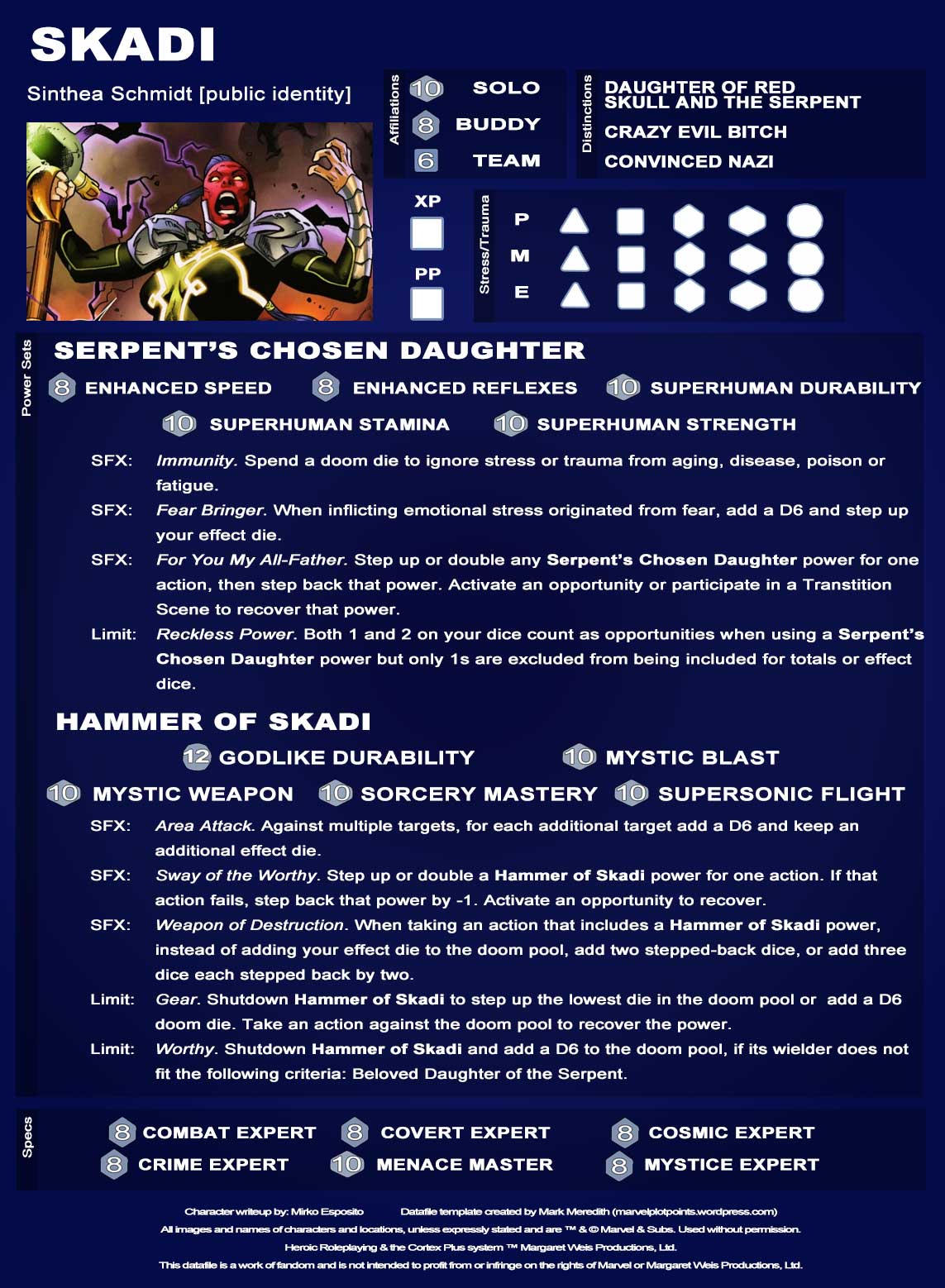 And finally we have the hammer weapon power sets. Use these datafiles to customize your game. Will the hammers imbue those that found them in the original Fear Itself run? Will Nerkodd’s hammer fall to another of Atlantean legacy? What would be required to qualify someone to be worthy of this tremendous terror? Or will Skadi’s hammer be found by some other vicious villainess? Or (gods forbid) what if a heroine is chosen to be The Serpent’s Daughter: such as Black Widow, or Susan Storm? Imagine the emotional turmoil that would occur if Skadi’s hammer fell into the hands of the loved one of a hero. Could the heroes fight against a Serpent-possessed Jane Foster? The possibilities are endless and up to YOU to decide!