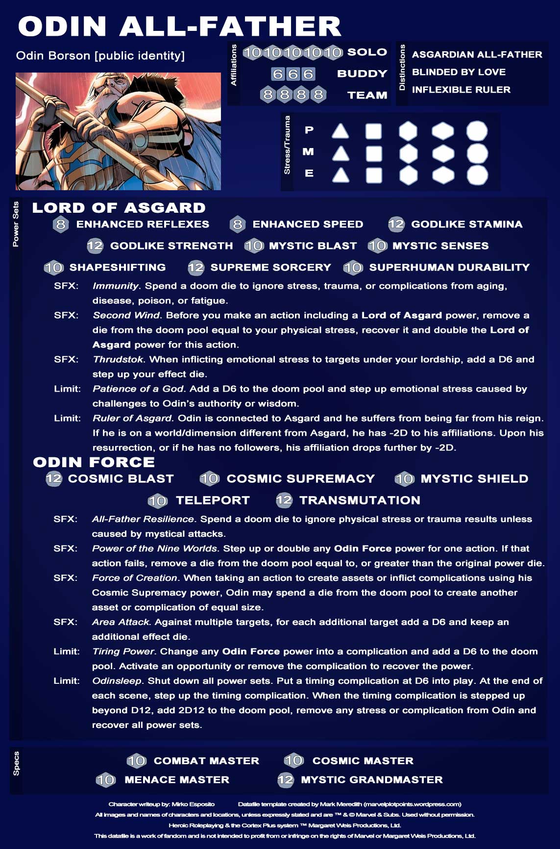 Of all the mighty of Asgard, one stands tallest. Odin son of Bor, lord of Asgard and father of Thor rules the realms of Yggdrasil and grants his boon or wrath on those he deems worthy or not. If you find yourself facing the lord of Asgard, your prayers may avail you not, for his temper is legendary and his wrath dreadful. There are many circumstances where facing Odin may be an endgame for heroes of the Marvel Universe.