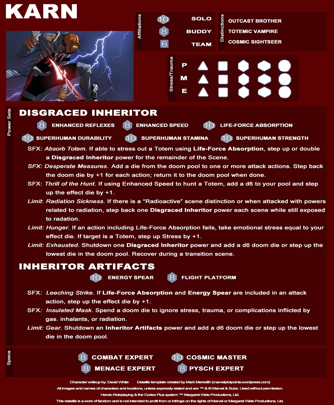 The Inheritors are first and foremost a family. Every family has their squabbles and their black sheep. In the Inheritors family, that secret shame is Karn. Karn has been banished from his home and has yet to prove his value and repentance to earn back his family’s love. So he wanders the threads of the multiverse trying to demonstrate his earnest sorrow and value to those he once held close. He is a dangerous opponent and Spiders should beware the tools he has collected to aid him as a hunter.
