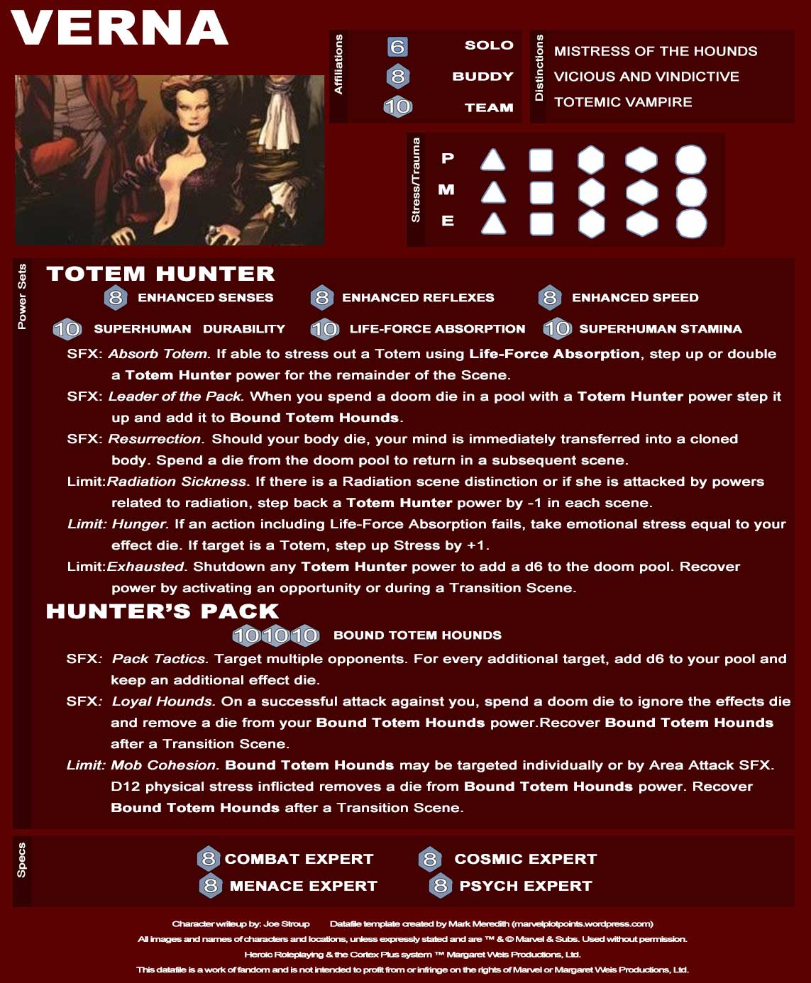 Verna is the pack leader of the hunt and she has gathered various warriors who she has bound to her will and grouped into smaller packs that she turns loose to hunt the Spider-Totems across the multiverse. She has a knack for gathering Spider-foes into groups and binding them to her will and they are quite good at running Spiders to ground. Will her pack prove too much for the Spiders, or will they slip loose and find safe haven from her seemingly unending supply of hunters?