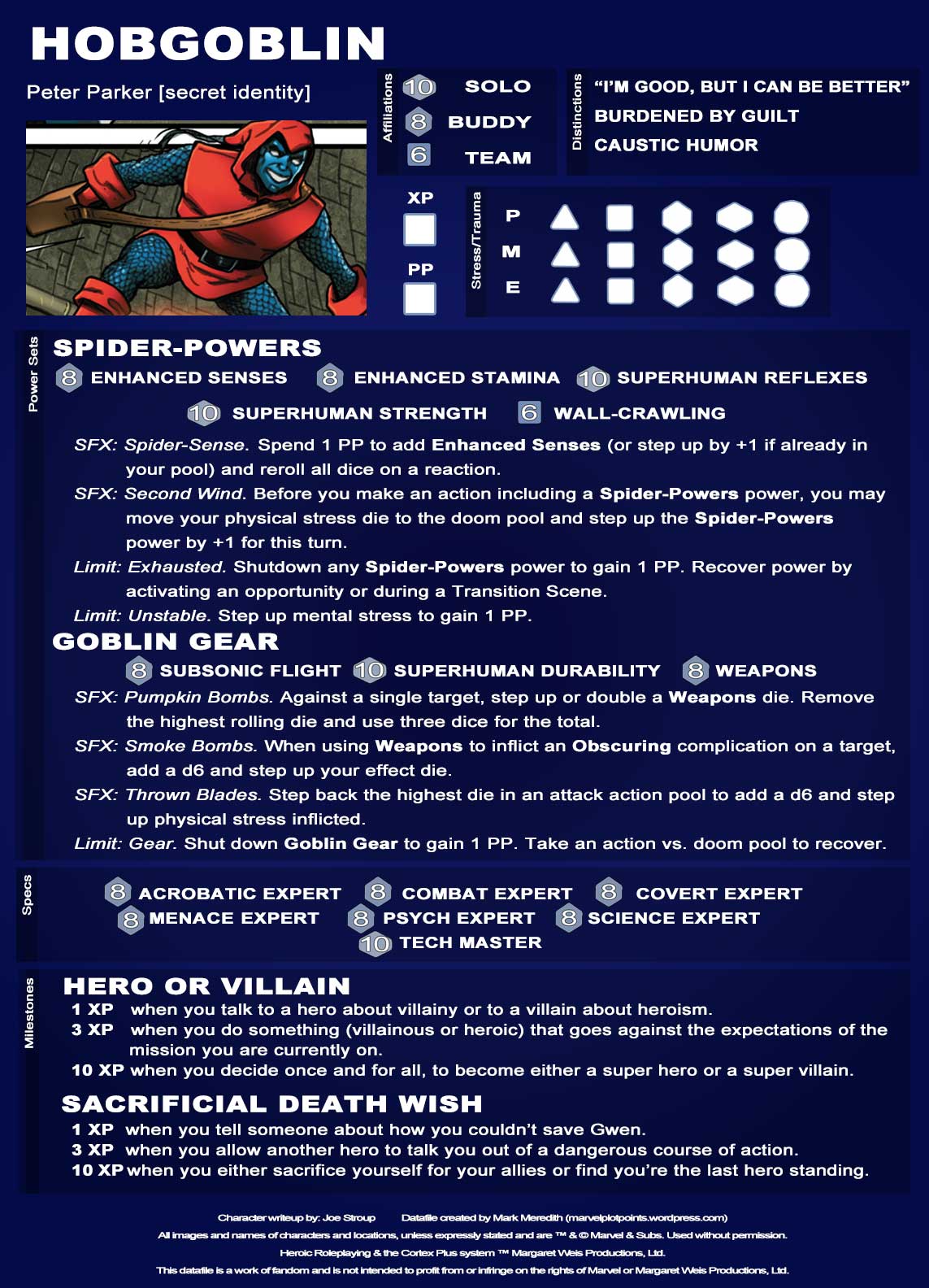 In the comics, these two Spider-Totems didn’t last long, but their stories were compelling and the possibility in their survival is pretty interesting. The first datafile answers the question of what would have happened if Peter Parker had lost himself in a rage and killed the Green Goblin after Gwen Stacey died. In his world, he abandoned the mantle of Spider-Man and instead became the Hobgoblin. How far will he go for redemption?
