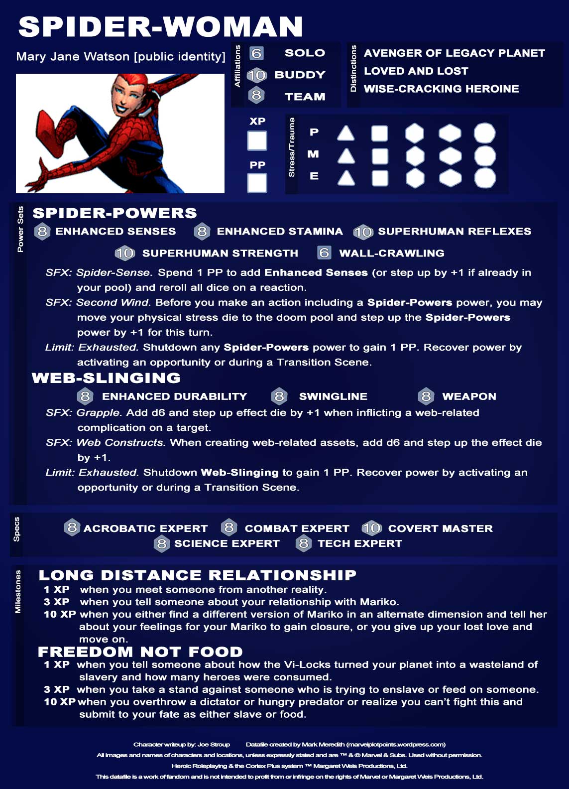 The second datafile answers the question of what might have happened in a world where Mary Jane was bitten by the spider. This Spider-Totem hails from the world depicted in the eXiles comics where her world was decimated by the Phalanx. The Avengers of her world were able to rally and drive back the techno-organic plague, but her story had a great deal still to be told. She’s already familiar with multi-versal travel so what might she do with the opportunity to travel to other worlds?