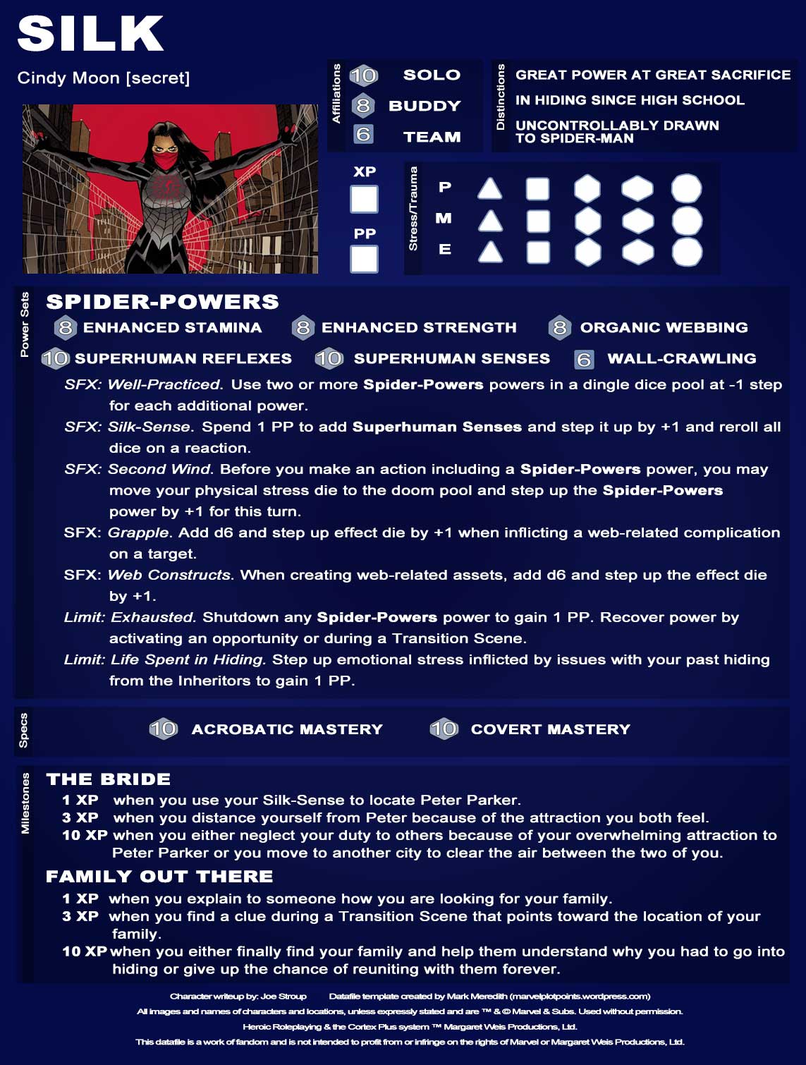 Silk’s story is interesting because she still has a romanticized picture of what a hero is in her head and very little practical experience playing it out in the real world. She sacrificed everything she knew in order to find safety from the Inheritors long ago, so she’s also missed out on a great deal of life. What kind of hero will she turn out to be in your game? Will she swing out into adventure and embrace the life of a lone vigilante or will she learn what it means to be a hero the hard way, through sacrifice and loss? You’ll just have to play to find out!