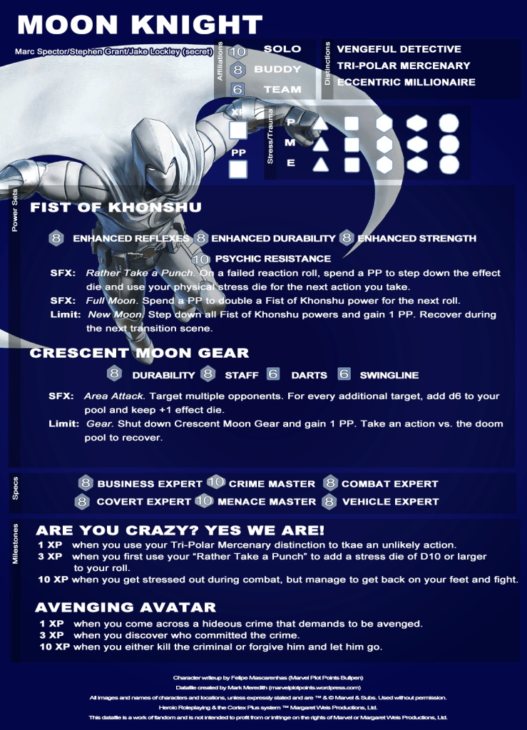 Whew! What a great season of Moon Knight! We previously published a version of Moon Knight here, but that was a long time ago, and I’ve updated the look of the datafiles a bit since that time. So here he is once again, just with a bit of an updated look. Enjoy!