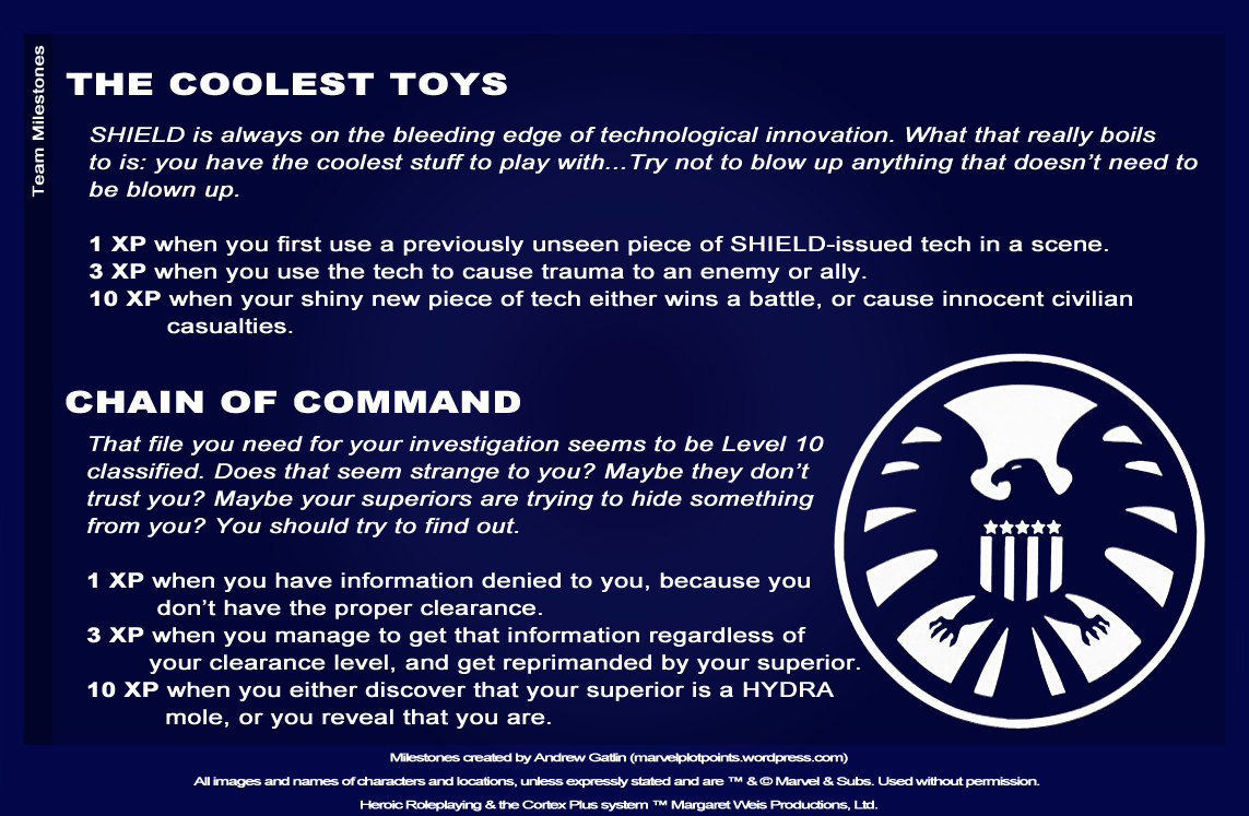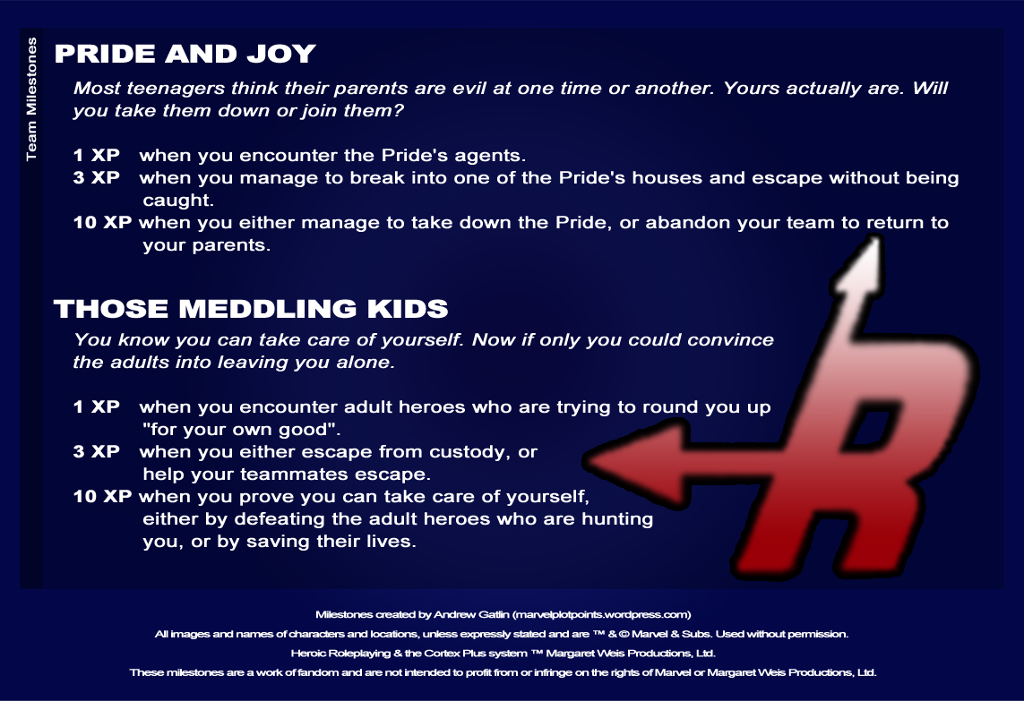 Every Monday we present a new Milestone Set, which will consist of two paths that a character can choose from. These milestones relate to the various teams throughout the Marvel universe. They fit somewhere between the individual milestones and the event milestones presented in Marvel Heroic Roleplaying Basic Game. Any character can take these milestones as long as they could be considered a member of the associated team, even if no one else at the game table is playing a character from that team.